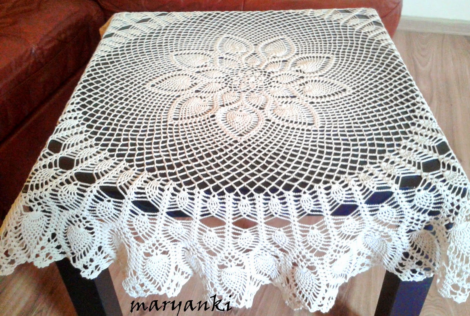 Trochę niefortunnie dobrałam nici - robiłam z Perle 5, zużyłam ok. 50dag. Obrusik wyszedł dość duży (tzn. długi, ale wąskawy), ma wymiary ok.160 x 54 cm. Niestety jest bardzo ażurowy i wiotkawy, trza mu dobrze "przykrochmalić".